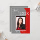 Duas cinzas com tonalidades e fundo vermelho brilhante com um design de onda é a configuração para a foto do seu formando moldada em vermelho, preto e branco correspondente. No topo está o Ano da Classe em branco, e seu nome está em um roteiro branco abaixo da fotografia. A parte de trás do convite é uma cinza consistente com bastante espaço para o seu texto personalizado. Este anúncio de graduação ou convite de festas é especialmente apropriado para aqueles cuja cor escolar é vermelha. Também funciona bem para formandos masculinos ou femininos. Brilhante, dramática e colorida!