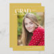 Este cartão com fotos de graduação moderno apresenta um layout editorial chic e uma grande foto. Na frente, "Formando" é escrito em simples, modesto, todos os bonés que aparecem no topo à esquerda, com o ano de graduação à direita. O design de tipografia se sobrepõe a uma grande foto vertical. Na parte inferior, adicione o nome do formando e a escola. A tipografia é branca contra um fundo amarelo alegre. A parte traseira da placa de graduação inclui um modelo opcional para adicionar detalhes da festa de formatura.