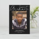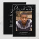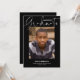 Esse cartão com fotos de graduação minimalista apresenta um simples design com roteiro informal. Na frente, o "Formando" é escrito em uma caligrafia casual através do topo, com uma grande foto abaixo. Na parte inferior, adicione o nome do formando, a escola e o ano de graduação. A tipografia é branca contra um fundo preto-colorido. A parte traseira da placa de graduação inclui um modelo opcional para adicionar detalhes da festa de formatura.