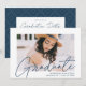 Convide convidados para comemorar a formatura com nossos convites para festa de formatura de fotos modernos. Os convites da festa de formatura de tendências apresentam a foto do formando com "Formando" em uma cobertura de script de caligrafia moderna do marinho. Personalize a frente dos convites adicionando o nome do formando, o nome da escola e o ano de graduação. O convite reverte para exibir seus detalhes de festa de formatura e um marinho de tendência e um padrão geométrico pontilhado branco.