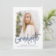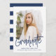Convites de festa de formatura de tendência com o dentro de foto do formando de um quadro de máscara texturizado com "Formando" em um script manuscrito de marinho. Personalize a frente dos convites para festa de formatura de fotos adicionando o nome do formando, o nome da escola e o ano de graduação. O convite reverte para exibir seus detalhes de festa de formatura com um padrão de stripe branco e marinho.