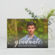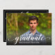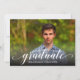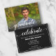 A palavra "formando" em um roteiro branco elegante junto com o nome do formando e o ano da classe (ou apagá-la) é impressa na frente desses convites para festas de formatura ou cerimônias de formatura. Coloque sua foto na frente - adicionamos uma camada preta de gradiente na parte inferior para que o "formando" seja legível sobre sua foto. A palavra Celebrar e suas informações pessoais sobre o partido no verso (borda pode ser excluída.) Mostramos branco em preto para o convite, mas você pode escolher qualquer cor de fundo e cor de fonte. Mais designs na nossa loja.