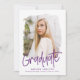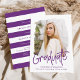 Convites de festa de formatura de tendência com o dentro de foto do formando de um quadro de máscara texturizado com "Formando" em um script manual roxo. Personalize a frente dos convites para festa de formatura de fotos adicionando o nome do formando, o nome da escola e o ano de graduação. O convite reverte para exibir seus detalhes de festa de formatura com um padrão de stripe roxo e branco.