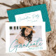 Convide convidados para comemorar a formatura com nossos convites para festa de formatura de fotos modernos. Os convites da festa de formatura de tendências apresentam a foto do formando com "Formando" em uma camada moderna de roteiro de caligrafia teal. Personalize a frente dos convites adicionando o nome do formando, o nome da escola e o ano de graduação. O convite reverte para exibir os detalhes da sua festa de formatura e um padrão geométrico pontilhado e preto branco.