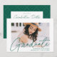 Convide convidados para comemorar a formatura com nossos convites para festa de formatura de fotos modernos. Os convites da festa de formatura de tendências apresentam a foto do formando com "Formando" em uma cobertura verde moderna de roteiro de caligrafia. Personalize a frente dos convites adicionando o nome do formando, o nome da escola e o ano de graduação. O convite reverte para exibir os detalhes da sua festa de formatura e um padrão geométrico verde e branco pontilhado.