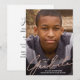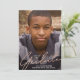 Este cartão de graduação simples e moderno apresenta uma camada falsa de script de folha de ouro rosa e uma foto de cheio. Na frente, "Formando" é exibido na parte inferior em um script manuscrito sobre uma foto vertical grande. Adicione seu nome de formando e foto, ano de graduação e escola à frente. No verso, você pode adicionar detalhes de festa de formatura.