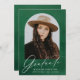 Convites de festa de formatura elegantes que incluem o dentro de fotos do formando de um quadro de arco com um fundo de aquarela verde. "Formando" é exibido em um roteiro branco moderno de caligrafia com o nome do formando, a escola e o ano de formando mostrado abaixo. A parte de trás do convite para festa de formatura de fotos apresenta os detalhes da sua festa de formatura com um fundo de cor d'água verde.
