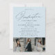 Convide convidados para comemorar o formando com nossos convites para festa de formatura de fotos elegantes! O design apresenta um script de caligrafia moderno com os detalhes da festa de formatura exibidos em letras negras contra um fundo azul claro. A festa de formatura exclusiva convida a apresentar três fotos seguidas na parte inferior do design. A graduação multifoto convida a reverter para exibir um simples padrão de faixa diagonal azul e branca do céu.