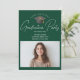 Este convite à festa de formatura verde-escuro moderno apresenta o seu nome de segundo grau ou de universidade para a classe 2025 acima da sua fotografia de retrato de mais velho favorita. Personalize com o seu ano de graduação com o script de chic manuscrito e o boné de formando para cartões personalizados de celebração de formandos de excelente. Adicione uma imagem de segundo no verso juntamente com os detalhes pessoais.