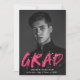 Convide convidados para comemorar o formando com nossos convites para festa de formatura de fotos do Modern Paint Splatter. O design apresenta a foto vertical do formando com "Formando" em caracteres rosa-quente com decapantes de tinta branca. Personalize a frente dos convites para festas de formatura criativas adicionando o nome do formando, o nome da escola e o ano de graduação. A parte traseira do convite apresenta os detalhes da sua festa de formatura com um fundo de pinturas rosa e brancas a quente. O convite para festa de formatura fotográfica é perfeito para ser usado tanto para festas de segundos graus como formandos.