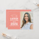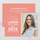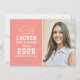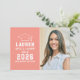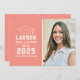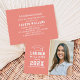 Anuncie seu segundo grau ou formando universitário em estilo com este anúncio de graduação e convite de festas. A placa de dois lados apresenta um retrato mais velho do formando com boné formando e design de tipografia branca simples e moderna. O fundo cor de salmão ou cor de laranja/rosa pode ser alterado para uma cor diferente com o recurso "Personalizar" e, em seguida, Editar/Fundo para selecionar outra cor.