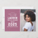 Anuncie seu segundo grau ou formando universitário em estilo com este anúncio de graduação e convite de festas. A placa de dois lados apresenta um retrato mais velho do formando com boné formando e design de tipografia branca simples e moderna. O fundo cor-de-rosa/vermelho-berço pode ser alterado para uma cor diferente com o recurso "Personalizar" e, em seguida, Editar/Fundo para selecionar outra cor.