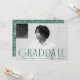 Convites simples de festa de formatura com a foto horizontal do formando com o "Formando" exibido em caracteres verdes e modernos de deco. Personalize a frente do convite para festa de formatura de fotos, adicionando o nome do formando, a escola e o ano de formando. O convite reverte para exibir os detalhes de sua parte com um plano de fundo geométrico verde e branco.