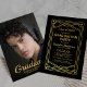 Gatsby excelente convites de festas formandos que apresentam uma foto de cheio do formando na parte frontal. No verso está um fundo preto clássico com uma borda de folha de ouro de vidro e uma modelo de festa de formatura de tipografia elegante.