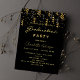 Um convite moderno e na moda para uma festa de formatura 20xx. Para ele e para ela. Um clássico fundo preto e ouro e filmagens do partido negro como decoração. Personalize e adicione um nome e detalhes da parte. O texto Graduação e o nome são escritos com um script de estilo manuscrito moderno. Ouros.