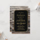 Um convite à festa de formatura de madeira com ouro bordado por ouro num fundo preto.