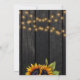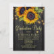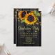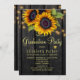 Modelo de convite para na moda de festa de formatura no estilo russo, sobre madeira marrom-escura apresentando grandes buquês de girassol de ouro amarelo e cordas de luzes cintilantes. Preencha suas informações nos pontos, Você pode optar por personalizá-las mudando ainda mais as fontes e as cores das letras. — O convite é adequado para festas de formatura de jardim/quintais rústicos. — Se precisar de assistência, por favor, entre em contato comigo!