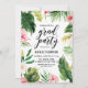 Um convite à festa de formatura divertido e colorido que inclui o hibisco da aquarela, as folhas de palma, as folhas de banana e outros sotaques tropicais. Essa festa de formatura personalizável é perfeita para as graduações de verão e temas tropicais.