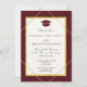 Clássico estilo elegante, vermelho escuro e convite para festa de formatura branca com uma estrutura geométrica dourada e chapéu de formando.