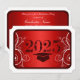 Um cartão de festa de formatura vermelho e branco convidando os apaixonados a honrar um formando maravilhoso em seu dia especial de celebração. As informações relativas ao convite à festa de formatura são escritas no verso com letras brancas.