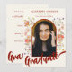 Celebre a conquista do seu formando com estes incríveis convites para festas de formatura de fotos inspirados em outono. Perfeito para formandos de segundo grau ou de faculdade, esses convites apresentam designs florais brancos, com um belo arco floral feito a partir de terras ricas, laranja queimada, amarelo e flores silvestres roxas colocadas sobre um fundo bege suave. O elegante roteiro de caligrafia laranja queimada adiciona um toque quente e artificial, complementando perfeitamente as vibrantes e pintadas manualmente flores silvestres. A tipografia moderna e modelos personalizáveis permitem personalizar facilmente os detalhes da festa de formatura, criando uma manutenção única e sincera para amigos e familiares. Desenhado pela artista Catherine Sweetman, as flores silvestres de uma só cor d'água evocam a beleza e o significado deste marco, trazendo um talento natural, boho para sua celebração. O modelo de foto incluído permite mostrar uma imagem carinhosa do seu formando, fazer esses convites de uma forma memorável de compartilhar a ocasião alegre.