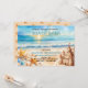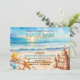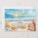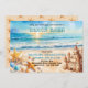 Convite de bash na praia para festa de formatura que você pode facilmente editar para a festa na praia, por exemplo, se você quiser. Design apresenta uma cena convidativa de praia com estrelas-do-mar, conchas marinhas, castelo de areia e o sol brilhando no horizonte.
