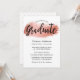 Convite de festa de formatura com um belo roteiro preto e um traço de pincel de cor rosa dourada. A parte traseira apresenta um rosa dourado e um padrão de bolinhas branco correspondentes.