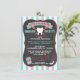 Formatação super divertida do convite de festas da Faculdade de Medicina Dentista ou dentária com listras ousadas e um centro de quadros com grandes fontes de dente, fio dental, banner e giz. A redação pode ser alterada para o ajustado das suas necessidades. Ilustração desenhada à mão por McBooboos.