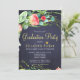 Modelo de convite para festa de formatura PHOTO clássico no fundo azul-escuro do quadro marinho da meia-noite apresentando rosas cor-de-rosa-claro e vermelho-coral com folhas e folhas azuis e verdes-sábios e com roteiro branco e ouro. Preencha suas informações nos pontos, Você pode optar por personalizá-las mudando ainda mais as fontes e as cores das letras. — O convite é adequado para primavera de verão ou outono cair ao ar livre ou festas de formatura rústicas de quintal. — Se precisar de assistência, por favor, entre em contato comigo!