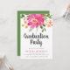Um convite brilhante, colorido e moderno da festa de formatura que caracteriza um grande buquê corajoso do pulverizador da aguarela floresce em cor-de-rosa tropical, na laranja e no verde. A frase "festa de formatura" está escova moderna na pia batismal rotulada do preto do estilo, no convidado de honra no rosa fúcsia, e nos detalhes do evento no preto no terço mais baixo do convite. A parte traseira do convite está no verde contínuo.