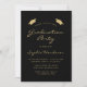 Este convite clássico e moderno para festas de formatura apresenta texto dourado sobre fundo preto. A palavra "Graduação" e o nome do formando aparecem em letra casual moderna, sob um par de bonés de conselho de argamassa de ouro. Personalize o convite com detalhes da parte e substitua a imagem de exemplo no verso por uma foto do seu formando.