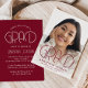 Esta frente deste design de convite para festa de formatura apresenta uma foto do formando com uma camada vermelha de burgundy. A palavra "FORMANDO" aparece em carateres de exposição, com o nome, a escola e o ano seguintes. No verso, forneça aos seus convidados detalhes em texto branco sobre fundo burgundy.