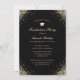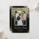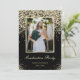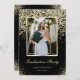 Convite moderno de festa de formatura de fotos preto e dourado com uma fonte elegante de script e um confete dourado.