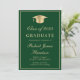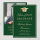 Anúncio e convite de festas elegantes do formandos verde apresentando um boné de formando de ouro, o nome do formando e o ano de aula em uma escrita de ouro, e sua escola, major e honra em tipografia de ouro clássica. No verso, adicione uma foto e personalize seus detalhes do partido.
