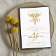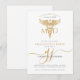 Comemore sua conquista em estilo com este médico moderno MD, convite de festa de formatura, com um design elegante com um caduceus dourado e um elegante monograma de caligrafia com guião dourado. O design limpo adiciona um toque de sofisticação. Dourado e preto. Disponível em impressão, como download digital ou ambos.