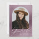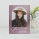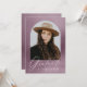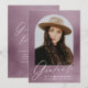 Convites de festa de formatura elegantes com dentro de fotografia de formando de um quadro de arco com um fundo aquoso roxo empoeirado. "Formando" é exibido em um roteiro branco moderno de caligrafia com o nome do formando, a escola e o ano de formando mostrado abaixo. A parte de trás do convite para festa de formatura de fotos apresenta os detalhes da sua festa de formatura com um fundo de cor d'água roxa empoeirado.