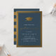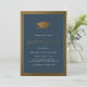 Convites de festas de formatura modernas, com boné de formatura de folha de ouro falso e borda dupla contra fundo azul marinho. Os detalhes do seu partido são exibidos em uma tipografia serif clássica com a ocasião em uma fonte de script de música. Perfeito para aqueles que procuram um eterno e um design simples. Este convite reverte para marinhos e listras de ouro.