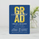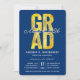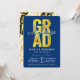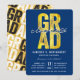 GRAD em tipografia negrito em folha de ouro falso sobre fundo azul-marinho escuro, Turma de 2024/2025, convite de festa de formatura chique e elegante.