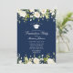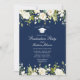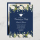 Um elegante convite à festa de formatura floral azul escura e branco, com foto ao contrário. Copyright Elegant Invites, todos os direitos reservados.