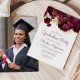 Este elegante convite de festa de formatura apresenta uma borda floral superior de flores de burgundy e folhas de folhas de folhas falsas de ouro. As palavras "Festa de formatura" e o nome do convidado de honra aparecem em um roteiro casual de burgundy, com o resto do texto personalizável em cinzas de carvão, serif. Substitua facilmente a imagem de exemplo no verso por sua foto vertical.