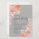 Um bonito convite para festas de formatura floral que inclui flores de cor d'água de pêssego em fundo de uma cinza, e texto e fundo de marinho. "Partido Formando" está em uma fonte moderna, escrita à mão.