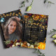 Lindo laranja enferrujado e escuro burgundy outono outono caem flores e bordas de abóbora com cordas de ouro brilhando sobre um fundo de madeira marrom escura fazer um charmoso convite para a festa de formatura FOTO com um roteiro de tipografia dourada para caligrafia. +++++++ Fácil de personalizar com seus detalhes e imagem em ambos os lados! Adequado para a rústica tradicional | país | fazenda | festas ou churrascos de quintais exteriores.