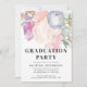 Um convite à festa de formatura moderna, feminino e macio, que inclui um grande buquê de flores a aquarelas em cor rosa pastel, azul e roxo A frase "festa de formatura" está em letras negrosas, em cinzas escuras. Personalize com o nome do gradauate e os detalhes do evento no terço inferior do convite. A parte de trás do convite contém uma lavagem de aquarela azul.