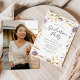 Convites elegantes para festas de formatura florais com detalhes de sua festa de formatura enquadrados por flores de aquarela em tons roxos e amarelos com folhagem verde esmagadora. A parte traseira do convite exibe a foto vertical de sangria de cheio. Os convites para a graduação floral amarela e púrpura são perfeitos para formandos segundos graus e universitários.