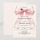 Celebre sua conquista com este convite de formatura elegante com laço rosa. O design apresenta um laço grande e sofisticado com fita adornada com cordões de pérolas delicados e um ícone sutil de capelo. É a escolha perfeita para estudantes do ensino médio ou universitários que buscam um anúncio feminino e chique. Fundo creme suave, marfim.