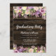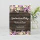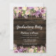 Este convite de festa de formatura floral roxo é perfeito para uma celebração do tema do país. Este design único apresenta flores de lavanda roxa, cor d'água, luzes de cordas e um fundo de madeira de celeiro escuro. Personalize facilmente este convite com os campos de modelo online.