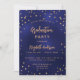 Um cartão de convite glamouroso para uma festa de formatura para ele e para ela. Um fundo azul marinho decorado com estrelas douradas falsas. A cor azul é irregular. Personalize e adicione um nome e detalhes da parte. O texto Graduação e o nome são escritos com um script de estilo moderno, escrito à mão. Texto colorido do ouro. Fundo: fundo azul marinho e estrelas ouros.