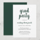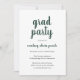 Convite simples de festa de formatura com um design clássico com "formando party" e o nome do formando em uma espessa escrita verde floresta sobre um fundo branco. A parte de trás é verde florestal sólido. Um convite elegante com um talento minimalista moderno para um formando feminino.