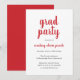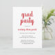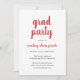 Convite simples de festa de formatura com um design clássico com "formando party" e o nome do formando com uma letra vermelha grossa sobre um fundo branco. A parte de trás é vermelha sólida. Um convite elegante com um talento minimalista moderno para um formando feminino.
