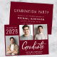 Anúncio e convite de festas de graduação vermelho-burgundy moderno com 3 fotos coladas, "Formando" em tipografia branca grande e ano de aula, nome e escola ou universidade em tipografia branca simples. Adicione os detalhes da parte no verso.